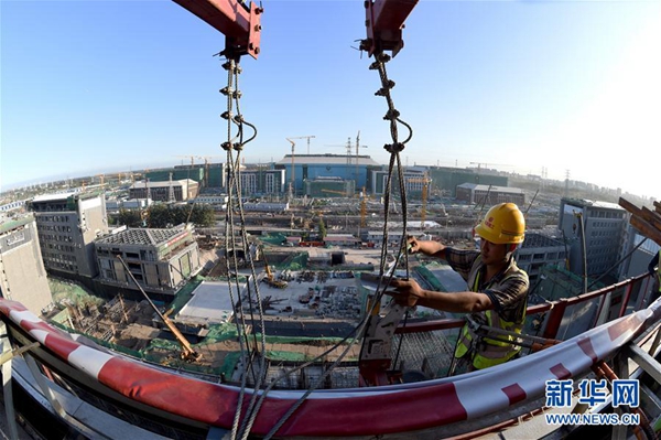 工人在北京建工集团城市副中心A2工程工地施工(2017年9月11日摄)。新华社记者 罗晓光 摄