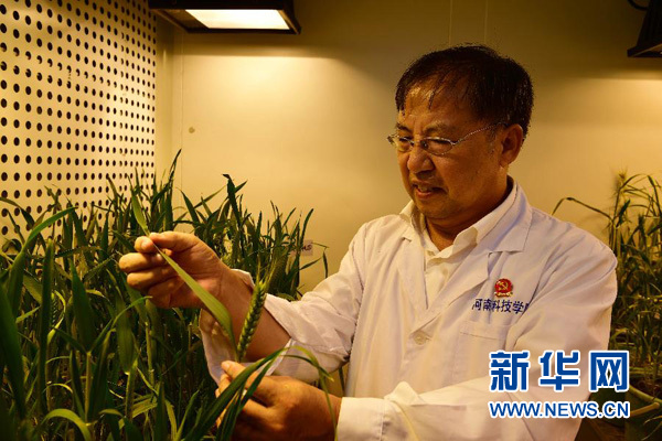 在河南科技学院小麦研究中心,小麦育种专家茹振钢在人工气候实验室查看小麦长势(9月30日摄)。新华社记者冯大鹏摄