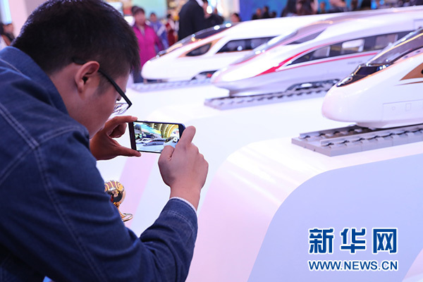 一名观众在北京展览馆举办的“砥砺奋进的五年”大型成就展现场拍摄“复兴号”列车模型(2017年10月12日摄)。新华社记者 张玉薇 摄