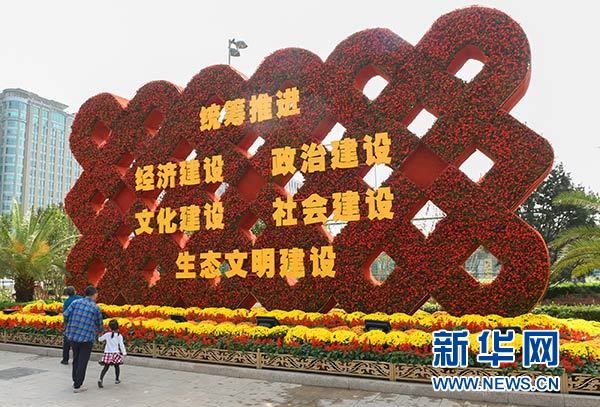 这是2017年10月1日在北京东单路口拍摄的“五位一体”花坛。新华社记者 李贺 摄