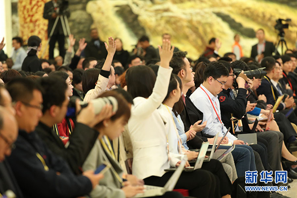 2017年10月17日下午,中国共产党第十九次全国代表大会新闻发言人在人民大会堂三楼金色大厅举行新闻发布会,并回答中外记者提问。图为记者在现场踊跃提问。新华网 翟子赫 摄