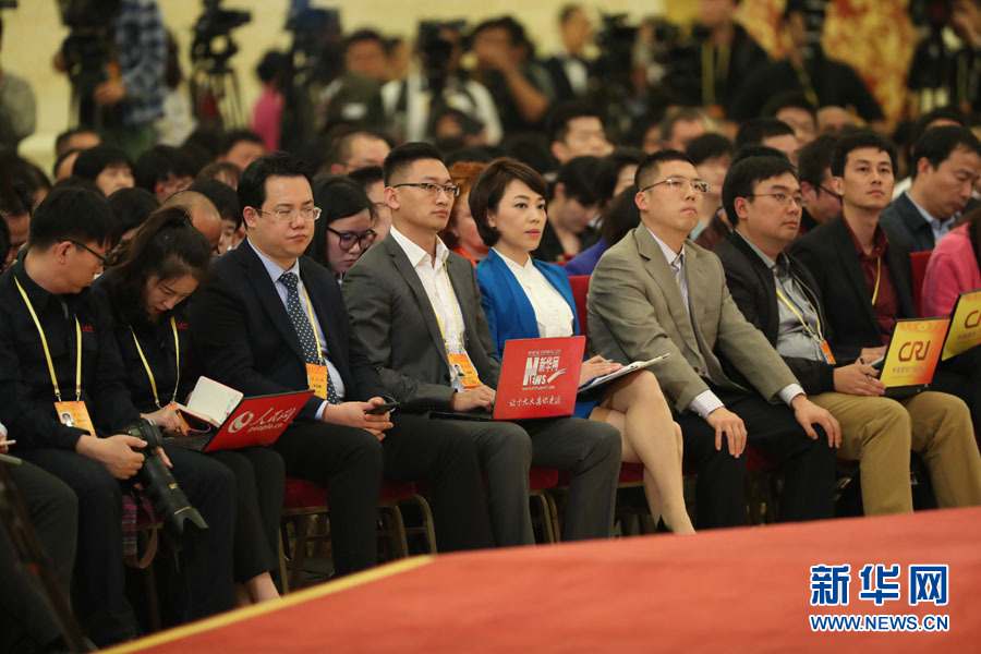 2017年10月17日下午,中国共产党第十九次全国代表大会新闻发言人在人民大会堂三楼金色大厅举行新闻发布会,并回答中外记者的提问。图为新华网记者在新闻发布会现场。新华网 翟子赫 摄
