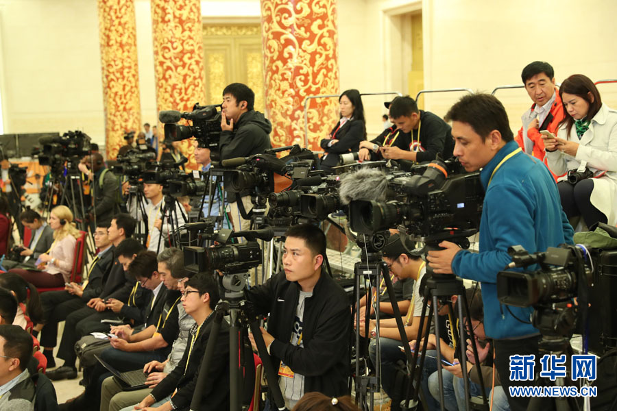 2017年10月17日下午,中国共产党第十九次全国代表大会新闻发言人在人民大会堂三楼金色大厅举行新闻发布会,并回答中外记者的提问。图为记者在新闻发布会现场。新华网 翟子赫 摄