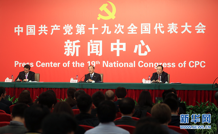 10月19日,十九大新闻中心举行记者会,邀请中纪委、中组部负责人介绍党的建设和全面从严治党相关情况。图为记者会现场。新华网 郝广鹏摄
