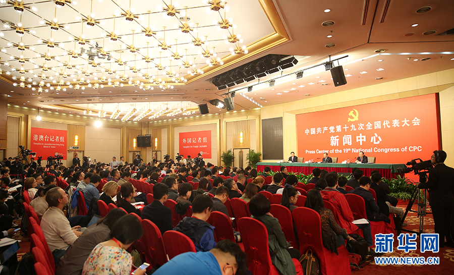10月19日,十九大新闻中心举行记者会,邀请中纪委、中组部负责人介绍党的建设和全面从严治党相关情况。图为记者会现场。新华网 郝广鹏摄