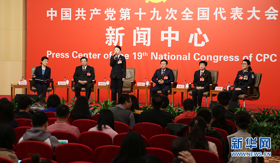 10月19日,十九大新闻中心举办集体采访,邀请政法战线代表谈全面推进依法治国。图为采访现场。新华网 郝广鹏摄