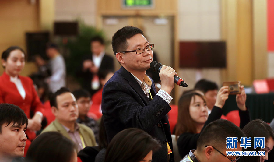 10月19日,十九大新闻中心举办集体采访,邀请政法战线代表谈全面推进依法治国。图为党建杂志、党建网记者提问。新华网 郝广鹏摄