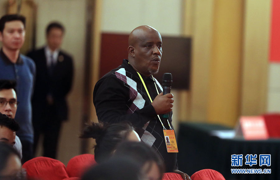 10月19日,十九大新闻中心举办集体采访,邀请政法战线代表谈全面推进依法治国。图为肯尼亚记者提问。新华网 郝广鹏摄