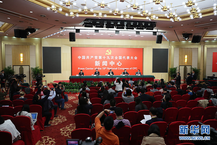 10月19日,十九大新闻中心举办集体采访,邀请工信和通讯领域代表谈走新型工业化道路。图为采访现场。新华网 郝广鹏摄