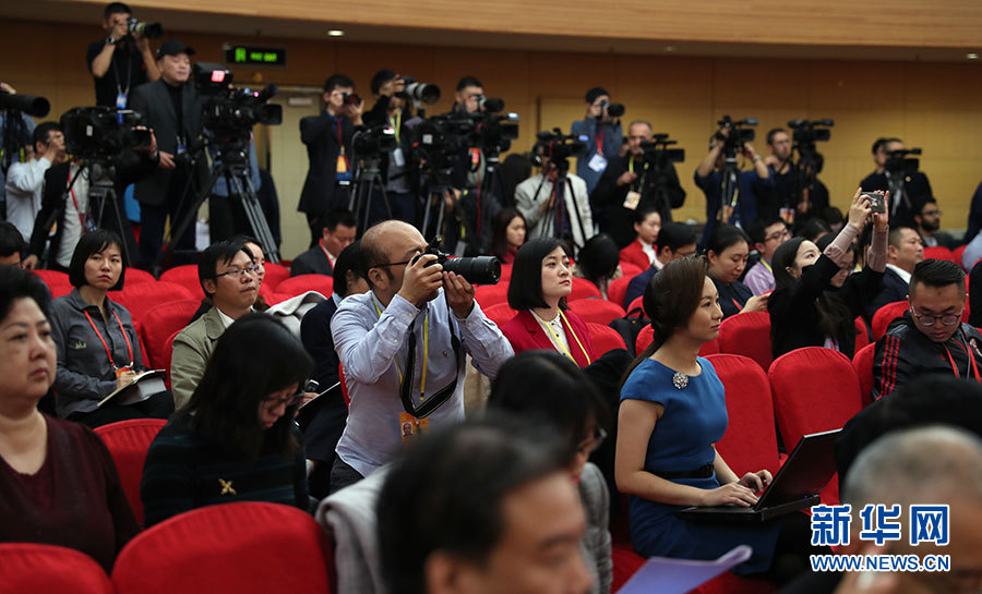 10月19日,十九大新闻中心举办集体采访,邀请工信和通讯领域代表谈走新型工业化道路。图为采访现场。新华网 郝广鹏摄