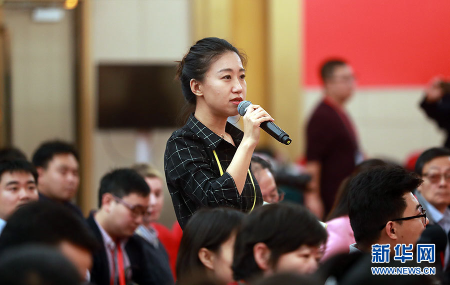 10月19日,十九大新闻中心举办集体采访,邀请工信和通讯领域代表谈走新型工业化道路。图为香港大公文汇传媒集团记者提问。新华网 郝广鹏摄
