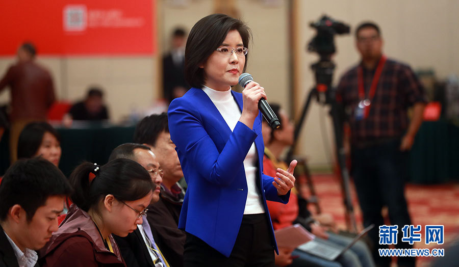 10月19日,十九大新闻中心举办集体采访,邀请工信和通讯领域代表谈走新型工业化道路。图为中央电视台、中国国际电视台记者提问。新华网 郝广鹏摄