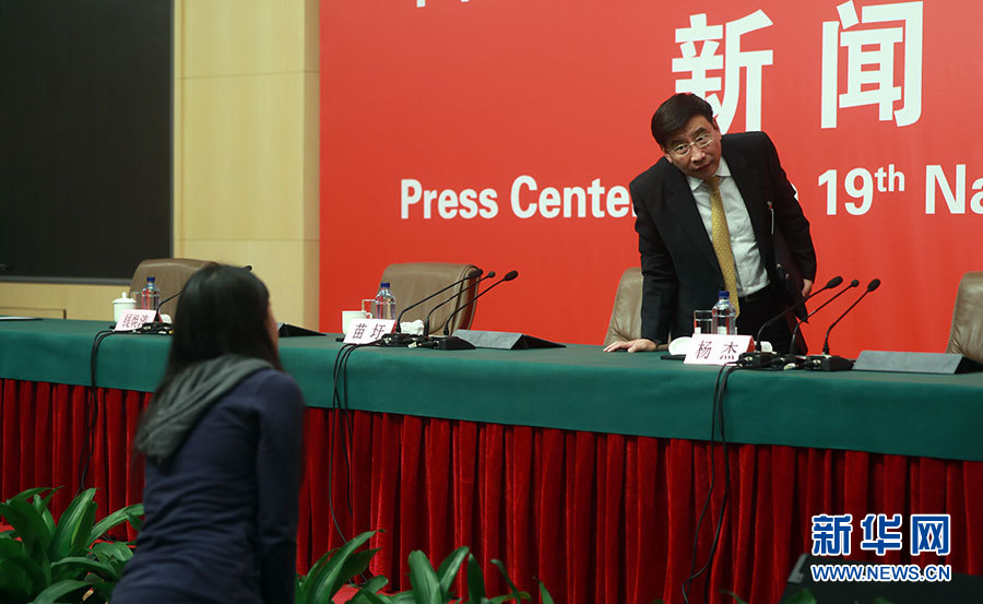 10月19日,十九大新闻中心举办集体采访,邀请工信和通讯领域代表谈走新型工业化道路。图为集体采访活动现场。新华网 郝广鹏摄