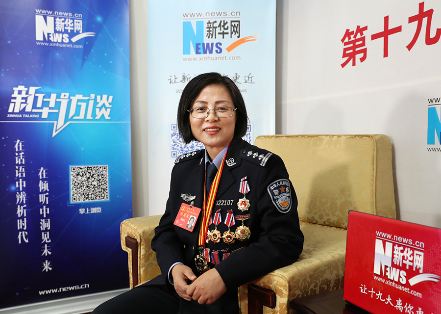 10月19日,十九大代表、宁波市公安局北仑分局出入境管理大队大队长胡朝霞来到新华网设在人民大会堂的十九大特别访谈间接受专访。新华网 翟子赫 摄