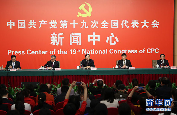 10月20日,十九大新闻中心举行记者会,邀请中宣部、中央文明办、文化部、新闻出版广电总局相关负责人介绍加强思想道德和文化建设情况,并回答记者提问。图为记者会现场。新华网 郝广鹏 摄