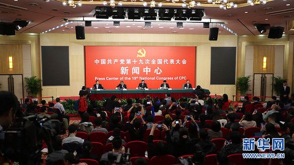 10月20日,十九大新闻中心举行记者会,邀请中宣部、中央文明办、文化部、新闻出版广电总局相关负责人介绍加强思想道德和文化建设情况,并回答记者提问。图为记者会现场。新华网 郝广鹏 摄