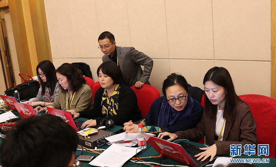 10月20日,十九大新闻中心举办集体采访活动,主题为“文化发展开创新局面”。图为新华网在现场直播。新华网 陈杰摄
