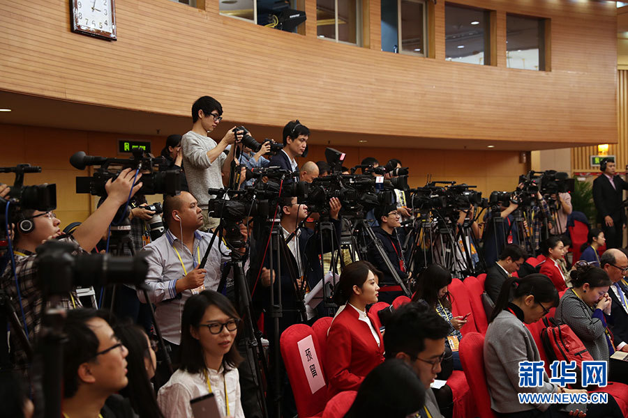 10月20日,十九大新闻中心举办集体采访活动,主题为“文化发展开创新局面”。图为现场记者。新华网 陈杰摄
