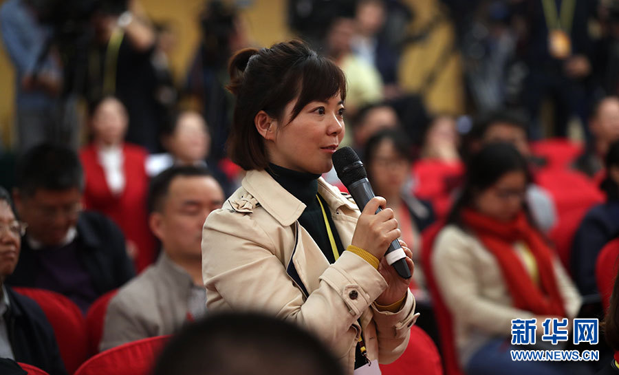 10月20日,十九大新闻中心举办集体采访活动,主题为“实施创新驱动发展战略”。图为科技日报中国科技网记者提问。新华网 郝广鹏摄