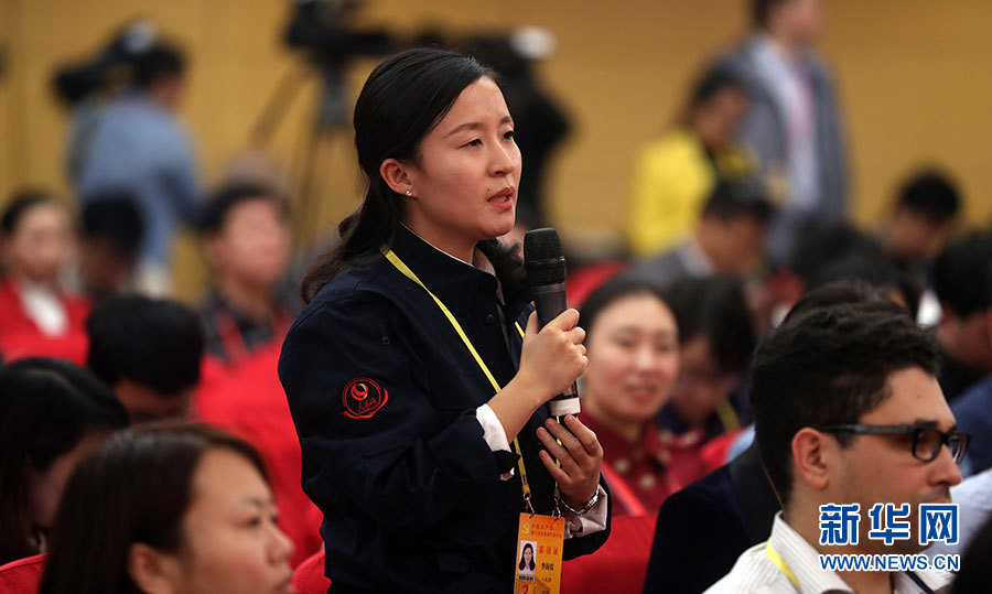 10月20日,十九大新闻中心举办集体采访活动,主题为“实施创新驱动发展战略”。图为人民网记者提问。新华网 郝广鹏摄