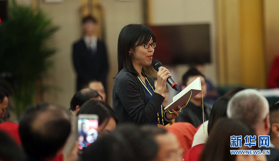 10月20日,十九大新闻中心举办集体采访活动,主题为“实施创新驱动发展战略”。图为中国日报记者提问。新华网 郝广鹏摄
