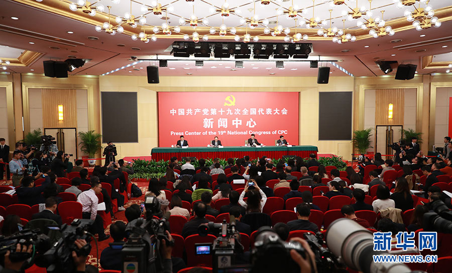 10月21日,十九大新闻中心举办记者招待会,邀请中共中央统战部常务副部长张裔炯、副部长冉万祥,中共中央对外联络部副部长郭业洲介绍党的统一战线工作和党的对外交往情况,并回答记者提问。图为记者招待会现场。新华网 郝广鹏摄