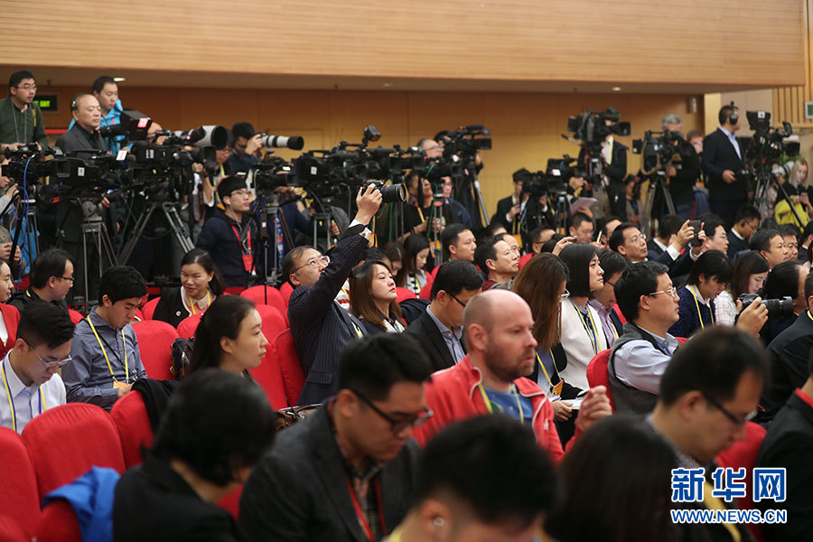 10月21日,十九大新闻中心举办记者招待会,邀请中共中央统战部常务副部长张裔炯、副部长冉万祥,中共中央对外联络部副部长郭业洲介绍党的统一战线工作和党的对外交往情况,并回答记者提问。图为现场记者。新华网 郝广鹏摄