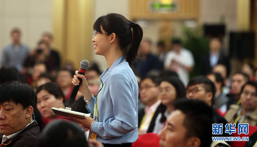 10月21日,十九大新闻中心举办记者招待会,邀请中共中央统战部常务副部长张裔炯、副部长冉万祥,中共中央对外联络部副部长郭业洲介绍党的统一战线工作和党的对外交往情况,并回答记者提问。图为中央人民广播电台记者提问。新华网 郝广鹏摄