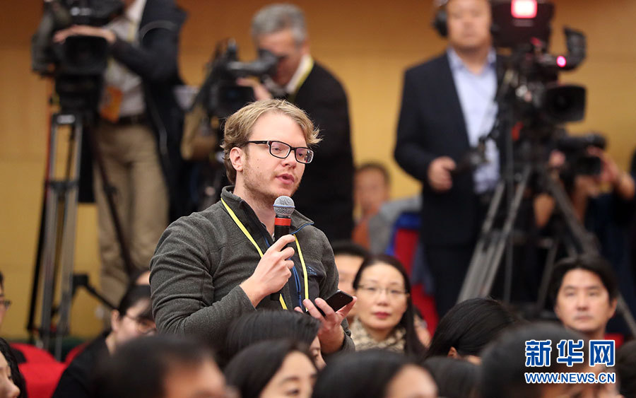 10月21日,十九大新闻中心举办记者招待会,邀请中共中央统战部常务副部长张裔炯、副部长冉万祥,中共中央对外联络部副部长郭业洲介绍党的统一战线工作和党的对外交往情况,并回答记者提问。图为彭博新闻社记者提问。新华网 郝广鹏摄