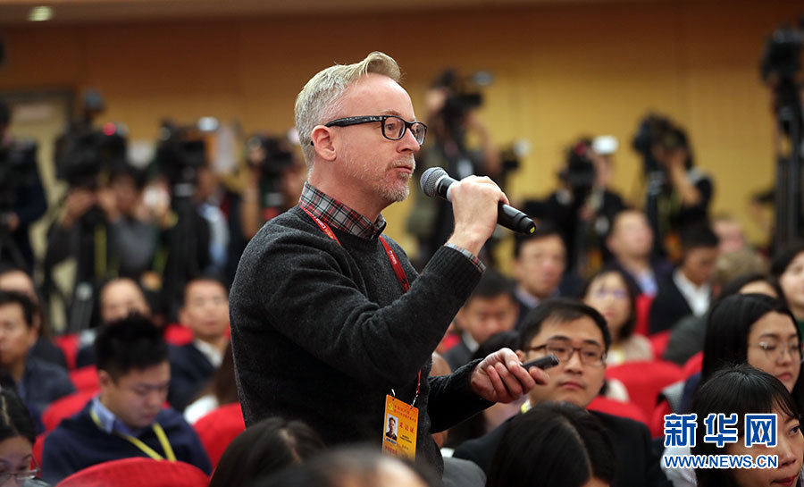 10月21日,十九大新闻中心举办记者招待会,邀请中共中央统战部常务副部长张裔炯、副部长冉万祥,中共中央对外联络部副部长郭业洲介绍党的统一战线工作和党的对外交往情况,并回答记者提问。图为美联社记者提问。新华网 郝广鹏摄
