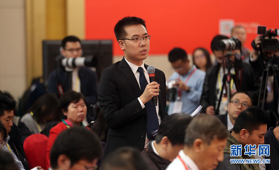 10月21日,十九大新闻中心举办记者招待会,邀请中共中央统战部常务副部长张裔炯、副部长冉万祥,中共中央对外联络部副部长郭业洲介绍党的统一战线工作和党的对外交往情况,并回答记者提问。图为中央电视台、中国国际电视台记者提问。新华网 郝广鹏摄
