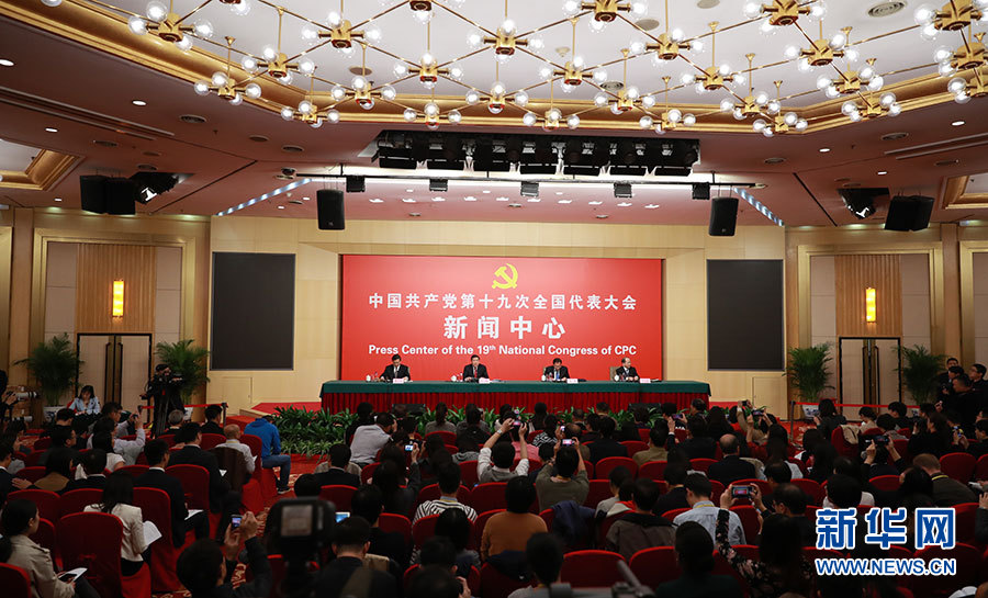 10月21日,十九大新闻中心举办记者招待会,邀请国家发展改革委党组书记、主任何立峰,副主任张勇,副主任宁吉喆介绍以新发展理念为引领,推进中国经济平稳健康可持续发展有关情况,并回答记者提问。图为记者招待会现场。新华网 郝广鹏摄