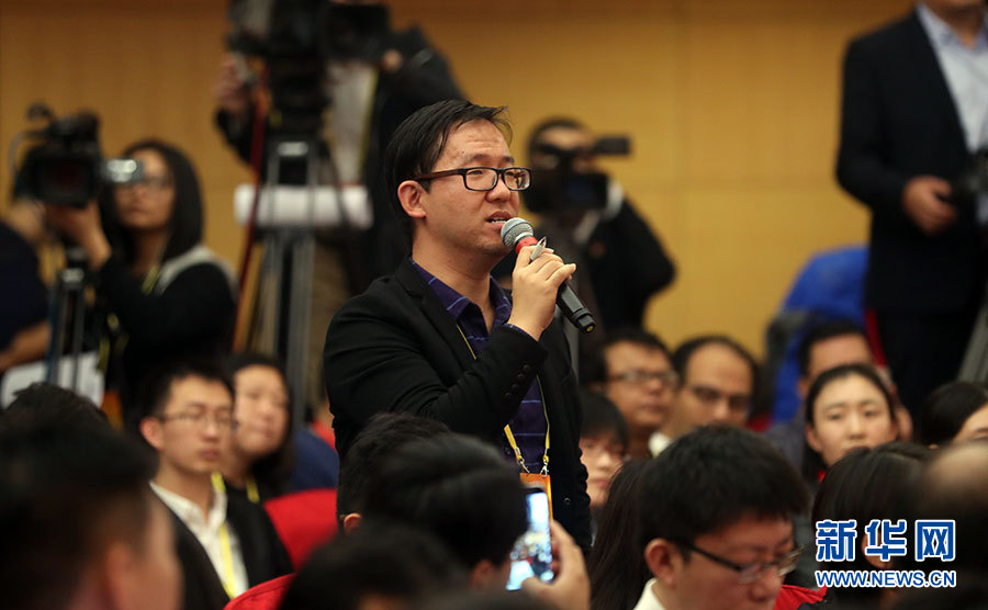10月21日,十九大新闻中心举办记者招待会,邀请国家发展改革委党组书记、主任何立峰,副主任张勇,副主任宁吉喆介绍以新发展理念为引领,推进中国经济平稳健康可持续发展有关情况,并回答记者提问。图为香港大公文汇传媒集团记者提问。新华网 郝广鹏摄