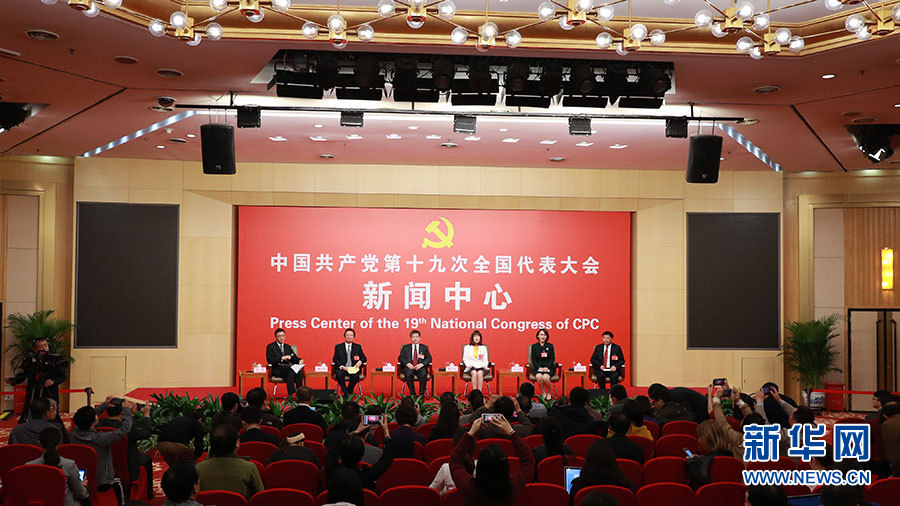 10月21日,十九大新闻中心举办集体采访活动,主题为“农业科技创新”。图为集体采访活动现场。新华网 郝广鹏摄