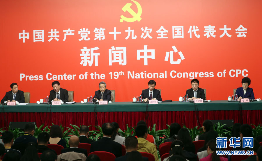 10月22日,十九大新闻中心举办记者招待会,邀请教育部党组书记、部长陈宝生,民政部党组书记、部长黄树贤,人力资源社会保障部党组书记、部长尹蔚民,住房城乡建设部党组书记、部长王蒙徽,国家卫生计生委党组书记、主任李斌介绍满足人民新期待,保障改善民生有关情况,并回答记者提问。图为记者招待会现场。新华网 郝广鹏摄