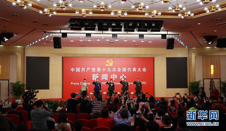10月22日,十九大新闻中心在梅地亚中心二层新闻发布厅举办集体采访活动,主题为“中国特色强军之路迈出坚定步伐”。图为集体采访活动现场。新华网 郝广鹏摄