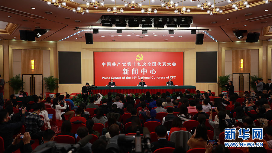10月23日,十九大新闻中心举办记者招待会,邀请中央财经领导小组办公室副主任杨伟民,环境保护部党组书记、部长李干杰介绍践行绿色发展理念,建设美丽中国有关情况,并回答记者提问。图为记者招待会现场。新华网 郝广鹏摄