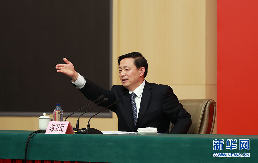 10月23日,十九大新闻中心举办记者招待会,邀请中央财经领导小组办公室副主任杨伟民,环境保护部党组书记、部长李干杰介绍践行绿色发展理念,建设美丽中国有关情况,并回答记者提问。图为主持人郭卫民。新华网 郝广鹏摄