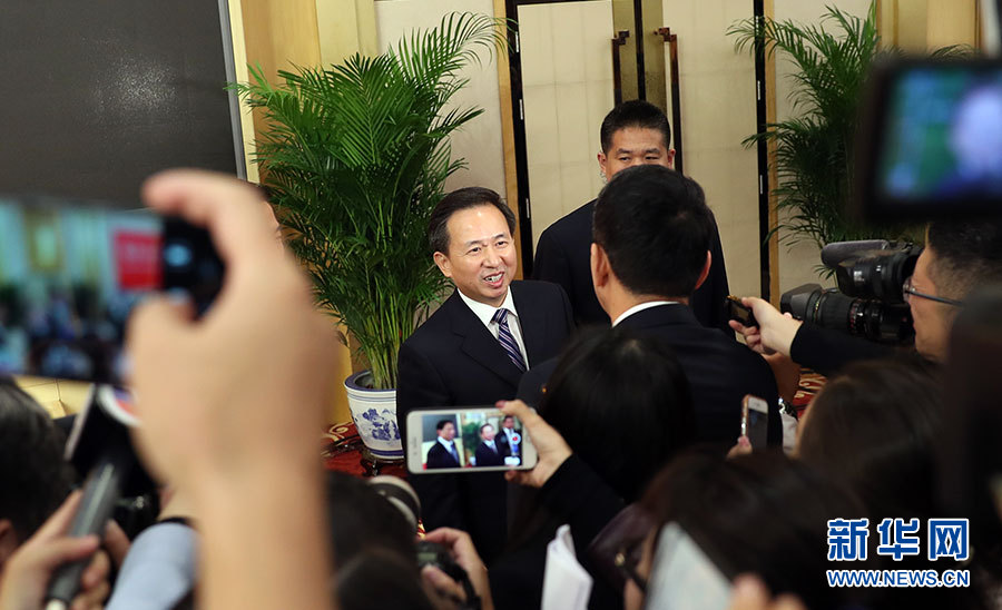 10月23日,十九大新闻中心举办记者招待会,邀请中央财经领导小组办公室副主任杨伟民,环境保护部党组书记、部长李干杰介绍践行绿色发展理念,建设美丽中国有关情况,并回答记者提问。图为环境保护部党组书记、部长李干杰接受记者采访。新华网 郝广鹏摄