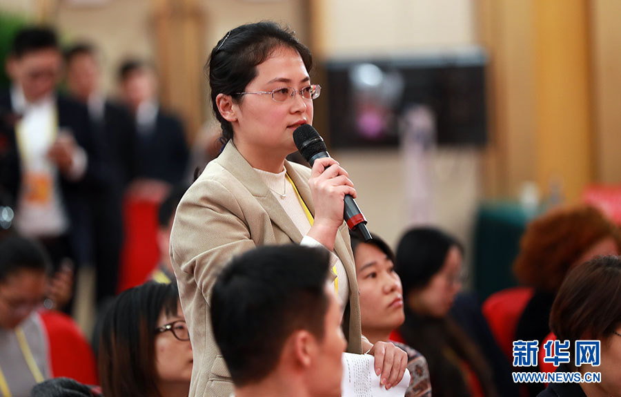 10月23日,十九大新闻中心举办集体采访活动,主题为“打好生态环保攻坚战”。图为香港紫荆杂志社记者提问。新华网 郝广鹏摄