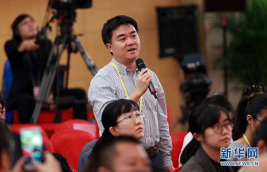 10月23日,十九大新闻中心举办集体采访活动,主题为“打好生态环保攻坚战”。图为中国国际广播电台记者提问。新华网 郝广鹏摄