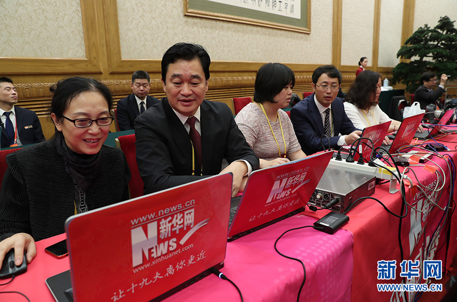 10月25日,党的十九届中央委员会第一次全体会议新选出的中央政治局常委将同中外记者见面。图为新华网直播团队在见面会现场准备直播。新华网 翟子赫 摄