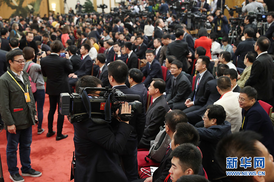 10月25日,党的十九届中央委员会第一次全体会议新选出的中央政治局常委将同中外记者见面。图为中外记者在见面会现场进行准备工作。新华网 翟子赫 摄