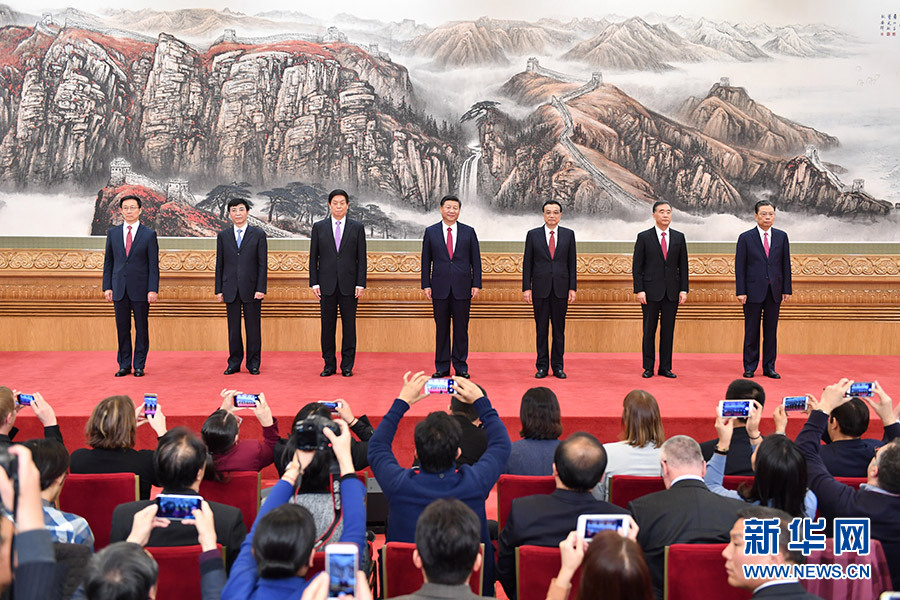 10月25日,党的十九届中央委员会第一次全体会议新选出的中央政治局常委同中外记者见面。新华社记者 李涛 摄