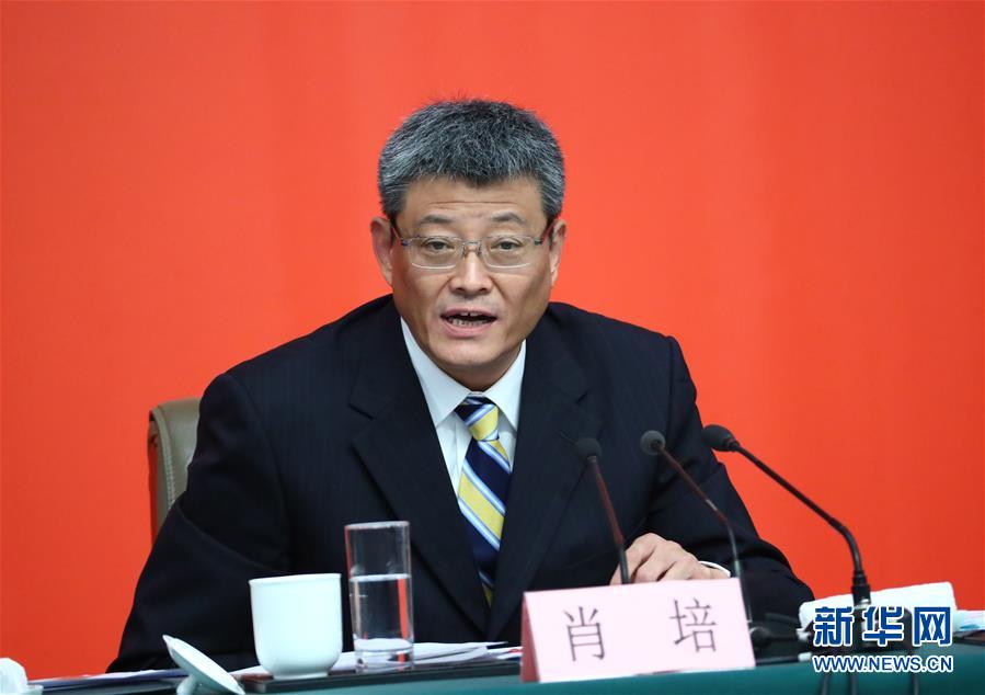 10月26日,中国共产党第十九次全国代表大会新闻发言人庹震召开专题新闻发布会,请中央纪委副书记肖培,中央政策研究室常务副主任、中央宣传部副部长王晓晖,中央文献研究室主任冷溶,国务院法制办公室党组书记、副主任袁曙宏,中央财经领导小组办公室副主任杨伟民,中央纪委驻国资委纪检组组长、国资委党委委员江金权解读十九大报告,并回答记者提问。这是肖培在新闻发布会上。新华社记者 张玉薇 摄