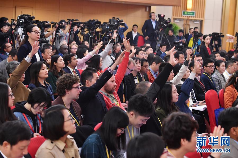 10月26日,中国共产党第十九次全国代表大会新闻发言人庹震召开专题新闻发布会,请中央纪委副书记肖培,中央政策研究室常务副主任、中央宣传部副部长王晓晖,中央文献研究室主任冷溶,国务院法制办公室党组书记、副主任袁曙宏,中央财经领导小组办公室副主任杨伟民,中央纪委驻国资委纪检组组长、国资委党委委员江金权解读十九大报告,并回答记者提问。这是记者举手提问。新华社记者 李鑫 摄