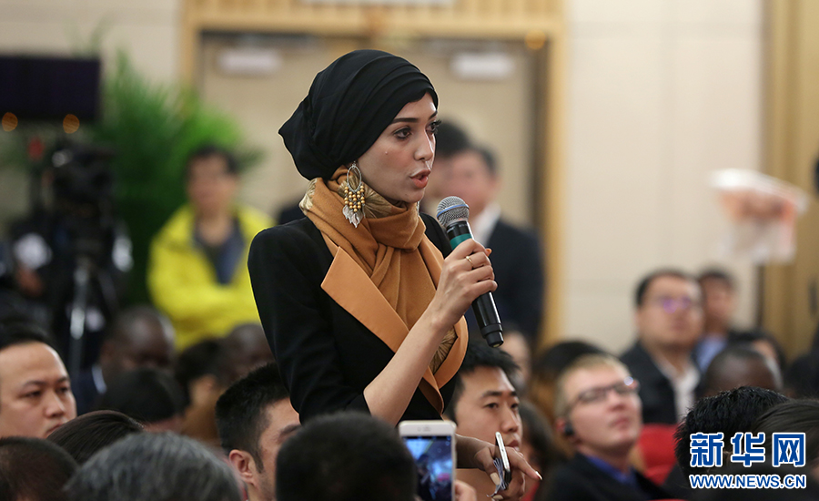 10月26日上午10:00,中国共产党第十九次全国代表大会新闻发言人在梅地亚宾馆二层新闻发布厅召开专题新闻发布会,请有关方面负责人解读十九大报告,并回答记者关心的问题。图为迪拜中阿卫视记者提问。新华网 王成云 摄
