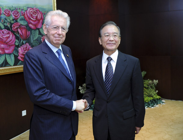 在会见蒙蒂时,温家宝表示,一段时间以来,欧盟采取了若干重大举措应对欧债问题,意大利积极推进财政改革和经济振兴计划,这些都让欧洲和国际社会看到了希望,增添了信心。中方支持欧方作出更有成效的努力,倡议中欧探讨在经贸、投资、基础设施、金融、高科技等领域开展大规模合作。意大利有灿烂的文化和很强的创新能力,在欧盟中发挥着重要影响。中方愿与意方加强协调合作,继续应对国际金融危机,推动中意、中欧关系取得更大进展。