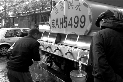 自来水变热变咸后,市自来水集团派应急供水车到达现场,确保居民基本生活用水。(来源:京华时报 记者 赵思衡 摄)