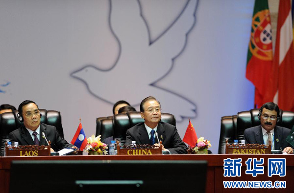 11月6日,中国国务院总理温家宝在老挝首都万象出席第九届亚欧首脑会议第二次领导人会议。 新华社记者 张铎 摄
